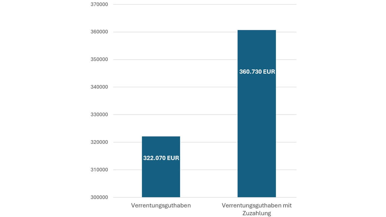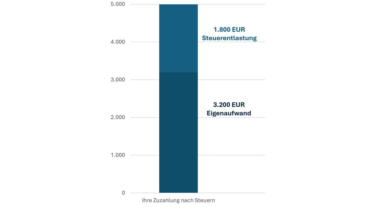Und auch die einmalige Zuzahlung von 5.000 Euro kann wie die laufende Investition steuerlich voll abgesetzt werden. Das heißt, Sie zahlen nach Steuern effektiv nur 3.200 Euro.